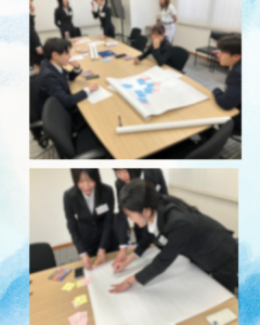 内定式後の交流会では、内定者の皆さん自身に当社の魅力をプレゼンしてもらう企画を実施しました💡2つのグループに分かれ、入社前に感じた当社の魅力を話し合い、発表してくれました。驚いたのは、ほとんど初対面であったにもかかわらず、積極的に意見を出し合い、すぐに打ち解けていたことです。まるで昔からの仲間のように活発に話し合い、それぞれの視点から見つけた「当社の魅力」を語る姿は、とても頼もしく印象的でした。皆さんの発表からは、私たち社員も気づかなかった新たな魅力の発見や、入社への熱意が伝わってきました😊